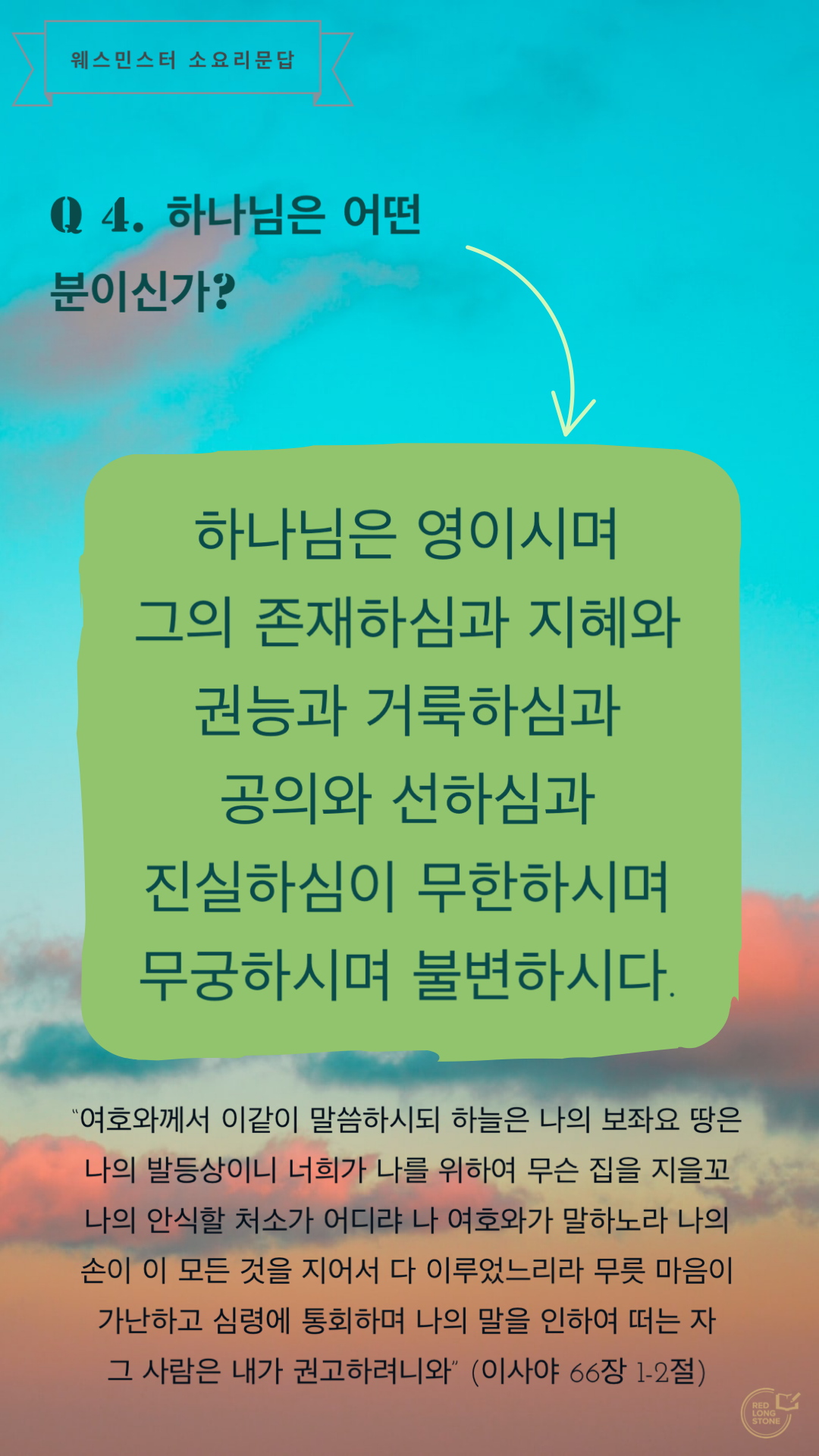 답: 하나님은 영이시며 그의 존재하심과 지혜와 권능과 거룩하심과 공의와 선하심과 진실하심이 무한하시며 무궁하시며 불변하시다.