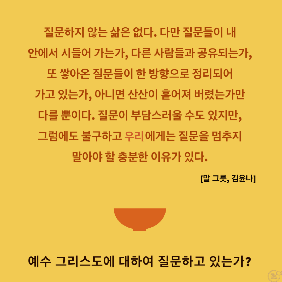 “질문하지 않는 삶은 없다. 다만 질문들이 내 안에서 시들어 가는가, 다른 사람들과 공유되는가, 또 쌓아온 질문들이 한 방향으로 정리되어 가고 있는가, 아니면 산산이 흩어져 버렸는가만 다를 뿐이다. 질문이 부담스러울 수도 있지만, 그럼에도 불구하고 우리에게는 질문을 멈추지 말아야 할 충분한 이유가 있다.