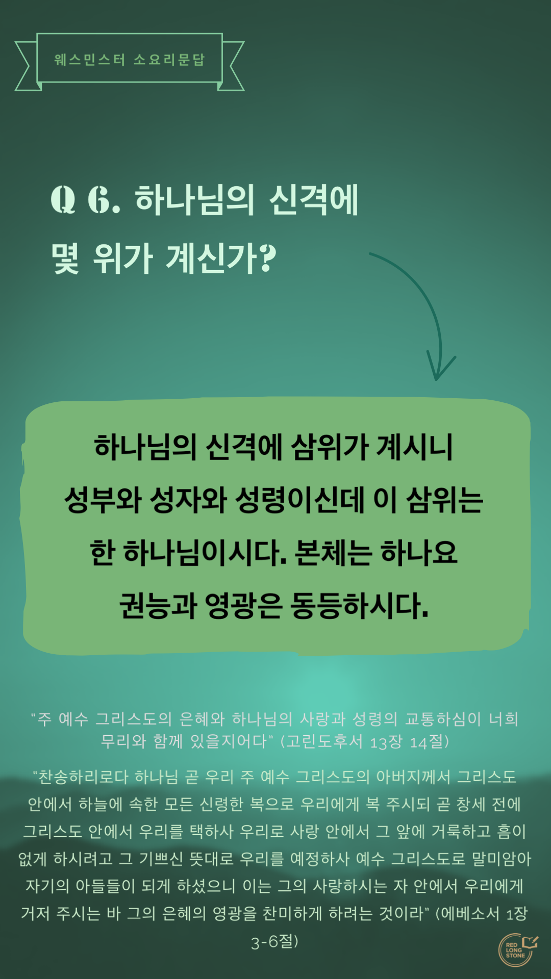 답. 하나님의 신격에 삼위가 계시니 성부와 성자와 성령이신데 이 삼위는 한 하나님이시다. 본체는 하나요 권능과 영광은 동등하시다.