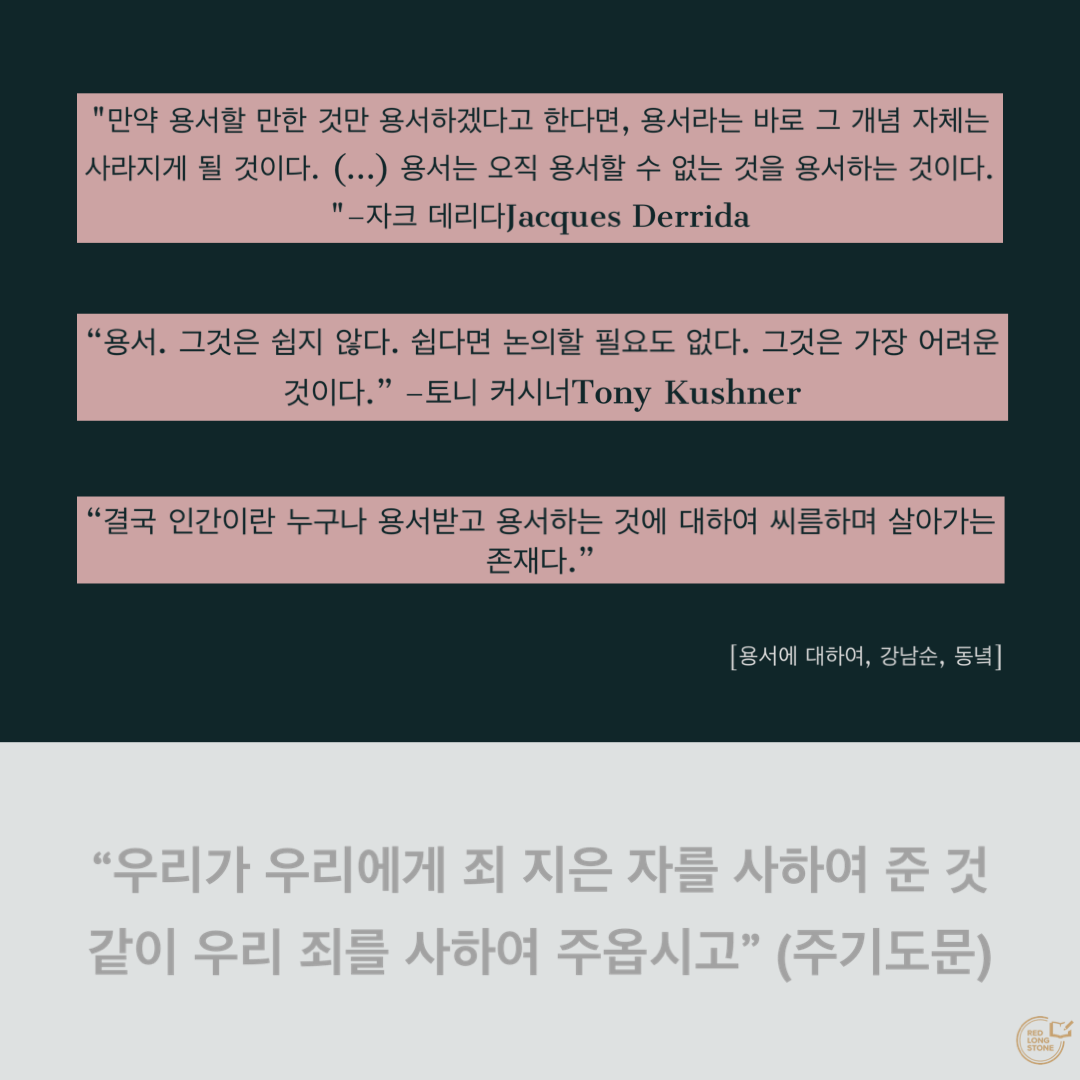 "만약 용서할 만한 것만 용서하겠다고 한다면, 용서라는 바로 그 개념 자체는 사라지게 될 것이다. (…) 용서는 오직 용서할 수 없는 것을 용서하는 것이다." –자크 데리다Jacques Derrida