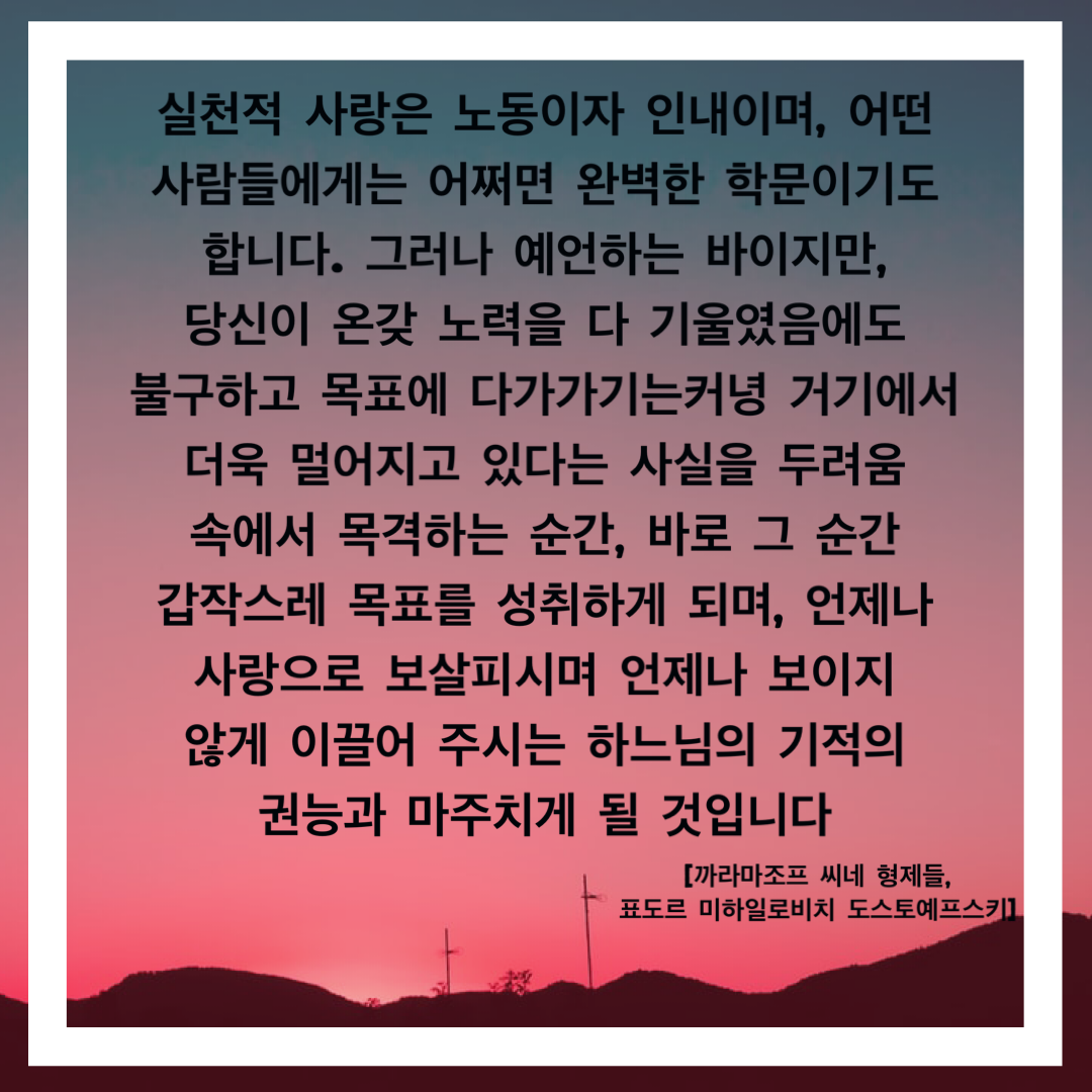 "실천적 사랑은 노동이자 인내이며, 어떤 사람들에게는 어쩌면 완벽한 학문이기도 합니다. 그러나 예언하는 바이지만, 당신이 온갖 노력을 다 기울였음에도 불구하고 목표에 다가가기는커녕 거기에서 더욱 멀어지고 있다는 사실을 두려움 속에서 목격하는 순간, 바로 그 순간 갑작스레 목표를 성취하게 되며, 언제나 사랑으로 보살피시며 언제나 보이지 않게 이끌어 주시는 하느님의 기적의 권능과 마주치게 될 것입니다"