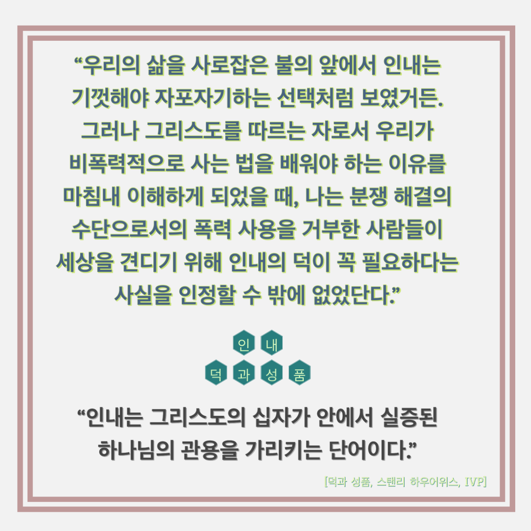 “우리의 삶을 사로잡은 불의 앞에서 인내는 기껏해야 자포자기하는 선택처럼 보였거든. 그러나 그리스도를 따르는 자로서 우리가 비폭력적으로 사는 법을 배워야 하는 이유를 마침내 이해하게 되었을 때, 나는 분쟁 해결의 수단으로서의 폭력 사용을 거부한 사람들이 세상을 견디기 위해 인내의 덕이 꼭 필요하다는 사실을 인정할 수 밖에 없었단다.”