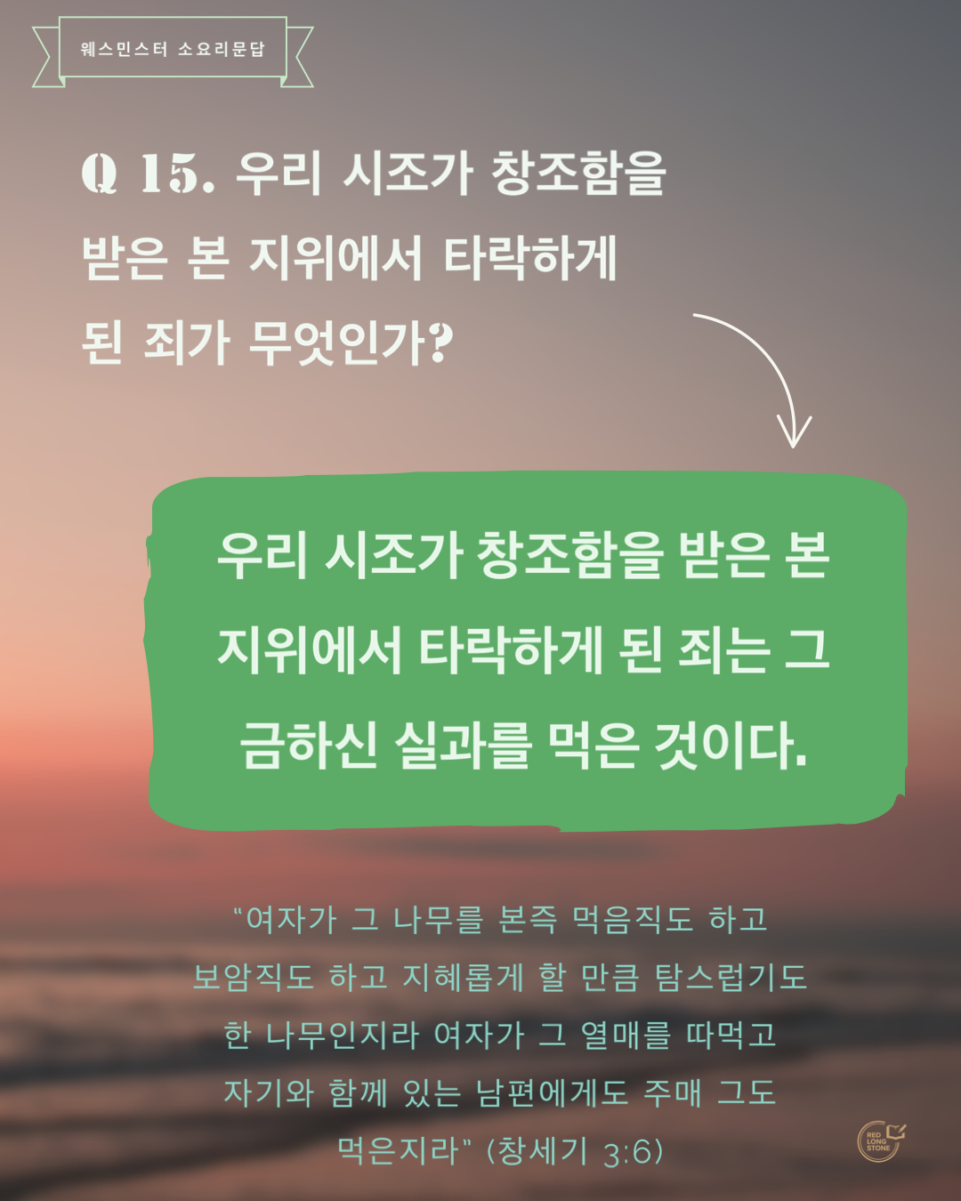 문 15. 우리 시조가 창조함을 받은 본 지위에서 타락하게 된 죄가 무엇인가?