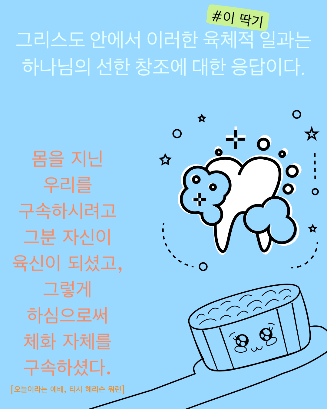“그리스도 안에서 이러한 육체적 일과는 하나님의 선한 창조에 대한 응답이다.”