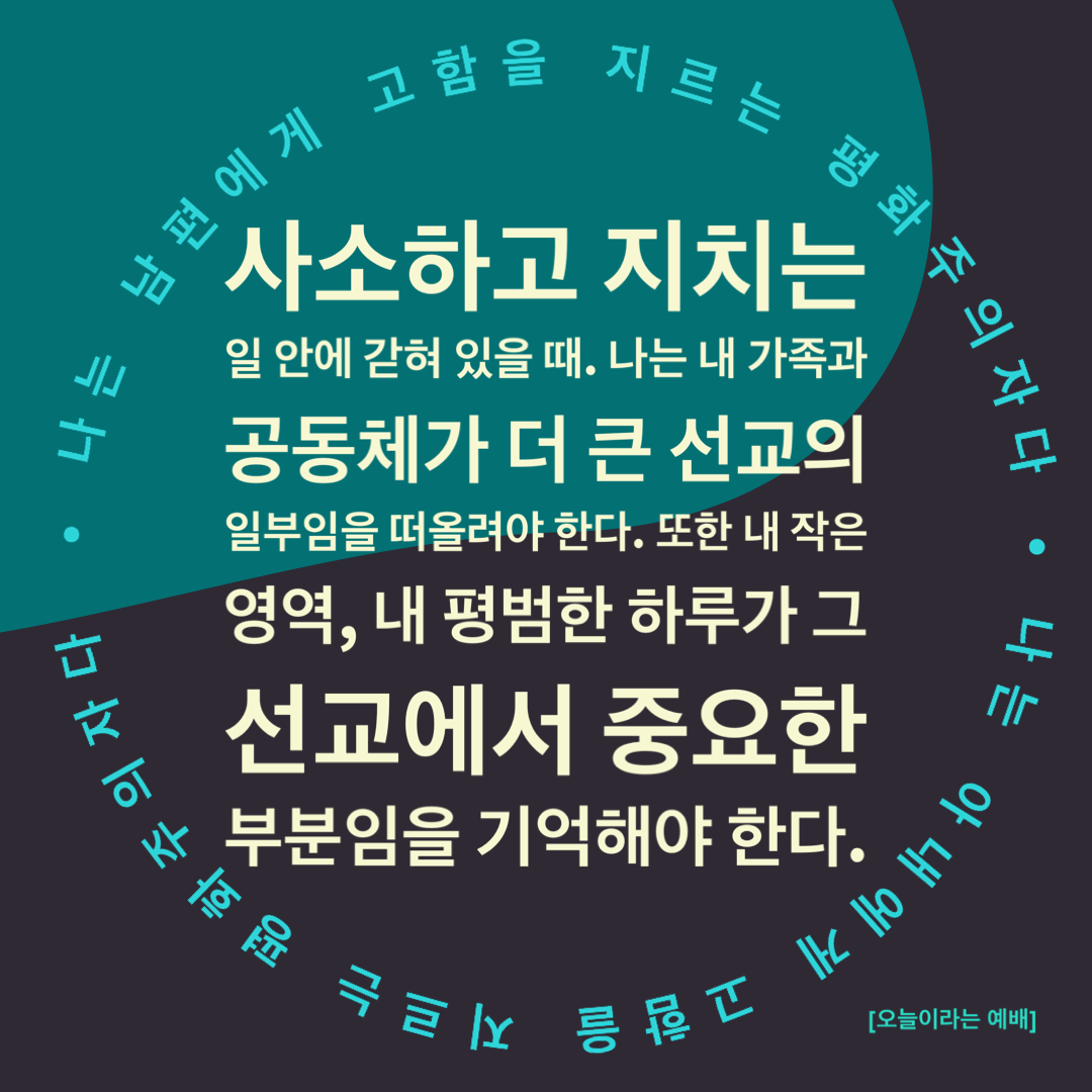 “사소하고 지치는 일 안에 갇혀 있을 때, 나는 내 가족과 공동체가 더 큰 선교의 일부임을 떠올려야 한다. 또한 내 작은 영역, 내 평범한 하루가 그 선교에서 중요한 부분임을 기억해야 한다.”