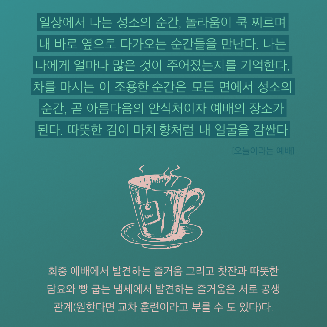“일상에서 나는 성소의 순간, 놀라움이 쿡 찌르며 내 바로 옆으로 다가오는 순간들을 만난다. 나는 나에게 얼마나 많은 것이 주어졌는지를 기억한다. 차를 마시는 이 조용한 순간은 모든 면에서 성소의 순간, 곧 아름다움의 안식처이자 예배의 장소가 된다. 따뜻한 김이 마치 향처럼 내 얼굴을 감싼다”