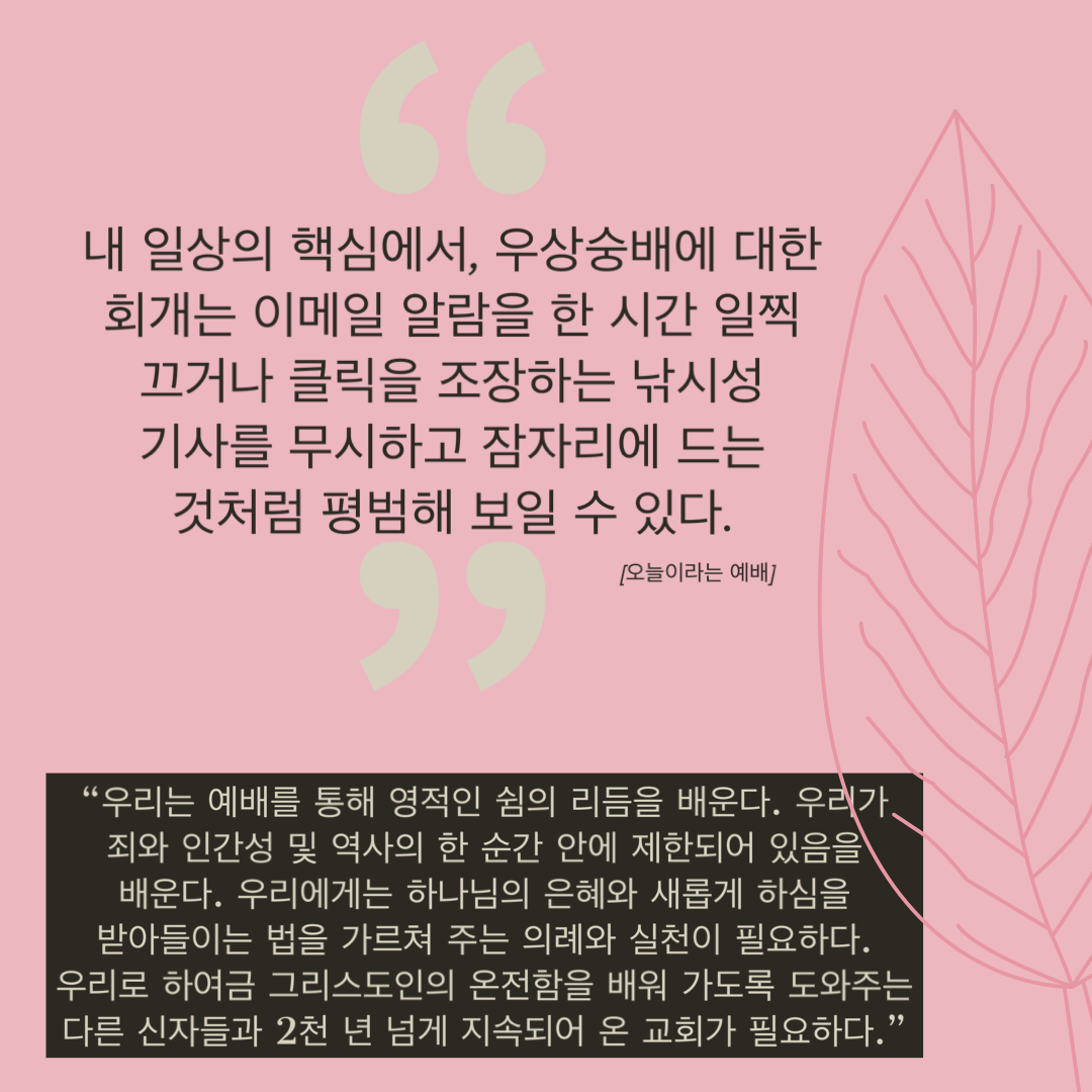 “우리는 예배를 통해 영적인 쉼의 리듬을 배운다. 우리가 죄와 인간성 및 역사의 한 순간 안에 제한되어 있음을 배운다. 우리에게는 하나님의 은혜와 새롭게 하심을 받아들이는 법을 가르쳐 주는 의례와 실천이 필요하다. 우리로 하여금 그리스도인의 온전함을 배워 가도록 도와주는 다른 신자들과 2천 년 넘게 지속되어 온 교회가 필요하다.”