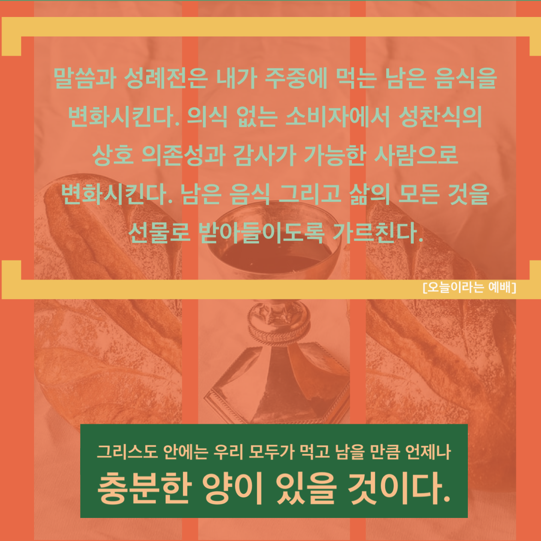 “말씀과 성례전은 내가 주중에 먹는 남은 음식을 변화시킨다.