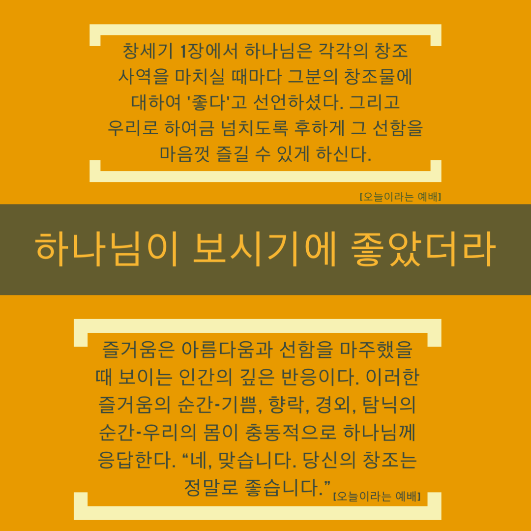 “즐거움은 아름다움과 선함을 마주했을 때 보이는 인간의 깊은 반응이다. 이러한 즐거움의 순간-기쁨, 향락, 경외, 탐닉의 순간-우리의 몸이 충동적으로 하나님께 응답한다. 네 맞습니다. 당신의 창조는 정말로 좋습니다.”