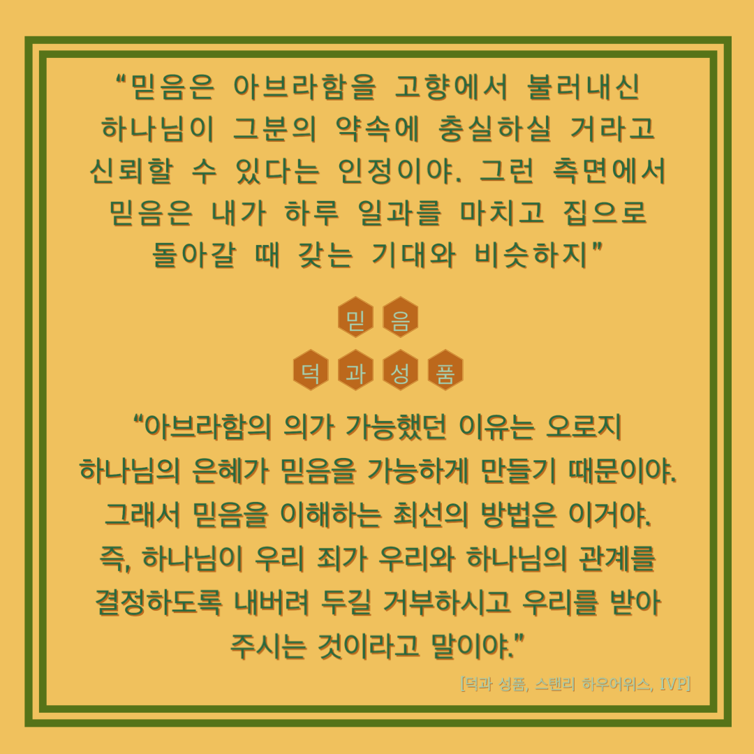 “믿음은 아브라함을 고향에서 불러내신 하나님이 그분의 약속에 충실하실 거라고 신뢰할 수 있다는 인정이야. 그런 측면에서 믿음은 내가 하루 일과를 마치고 집으로 돌아갈 때 갖는 기대와 비슷하지”