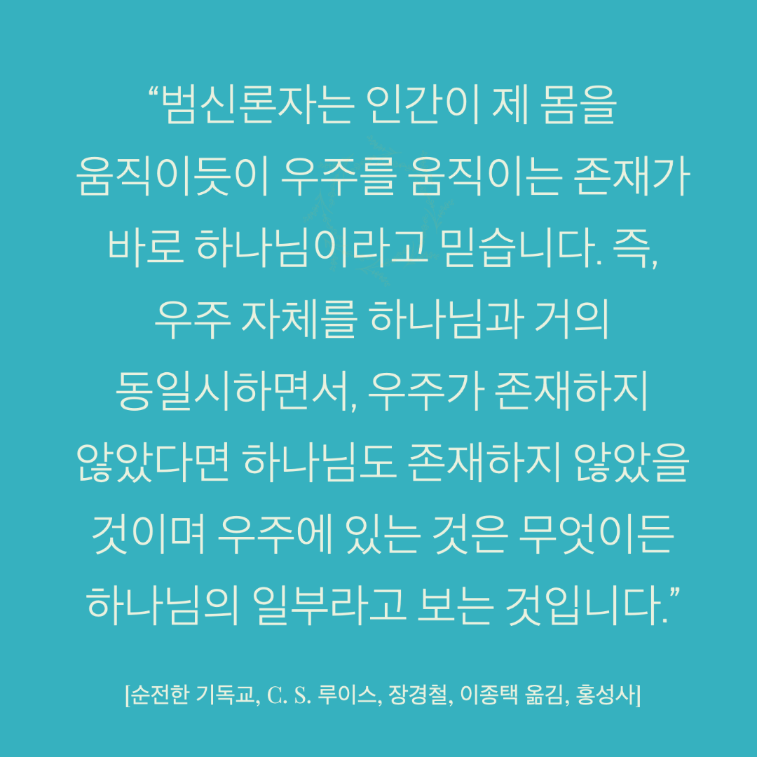 “범신론자는 인간이 제 몸을 움직이듯이 우주를 움직이는 존재가 바로 하나님이라고 믿습니다. 즉, 우주 자체를 하나님과 거의 동일시하면서, 우주가 존재하지 않았다면 하나님도 존재하지 않았을 것이며 우주에 있는 것은 무엇이든 하나님의 일부라고 보는 것입니다.”