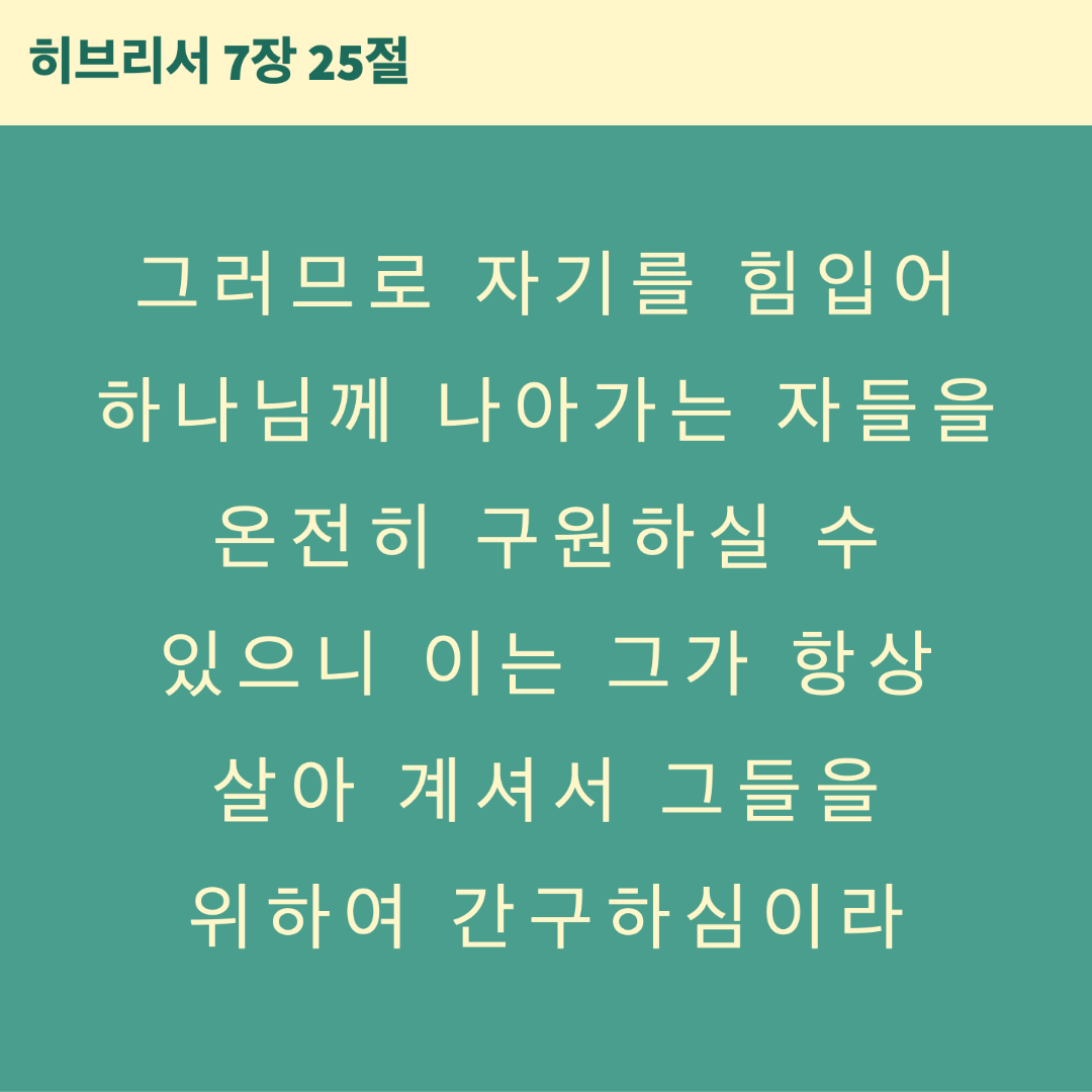 히브리서 7:25 “그러므로 자기를 힘입어 하나님께 나아가는 자들을 온전히 구원하실 수 있으니 이는 그가 항상 살아 계셔서 그들을 위하여 간구하심이라”