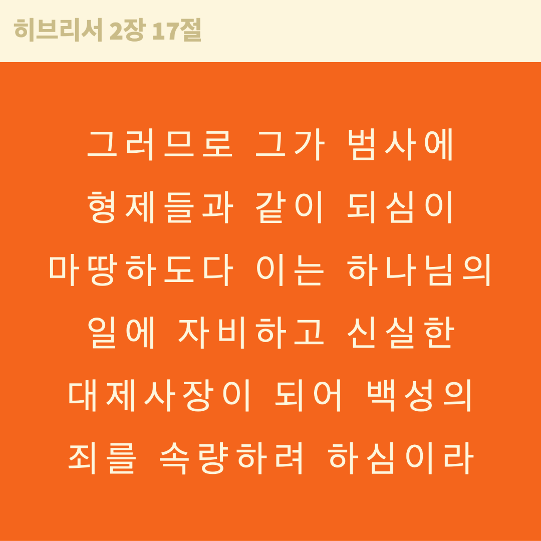 히브리서 2:17 “그러므로 그가 범사에 형제들과 같이 되심이 마땅하도다 이는 하나님의 일에 자비하고 신실한 대제사장이 되어 백성의 죄를 속량하려 하심이라”