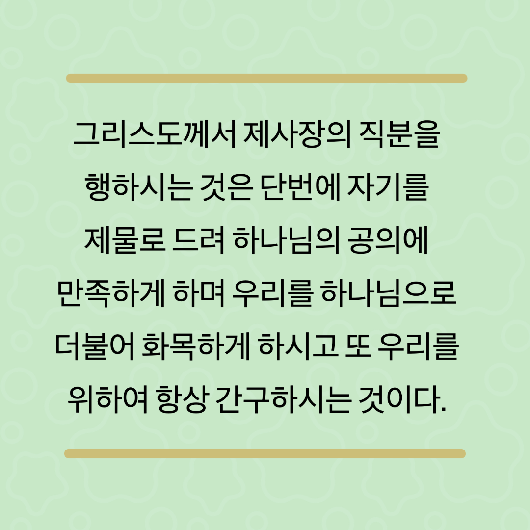 답: 그리스도께서 제사장의 직분을 행하시는 것은 단번에 자기를 제물로 드려 하나님의 공의에 만족하게 하며 우리를 하나님으로 더불어 화목하게 하시고 또 우리를 위하여 항상 간구하시는 것이다.