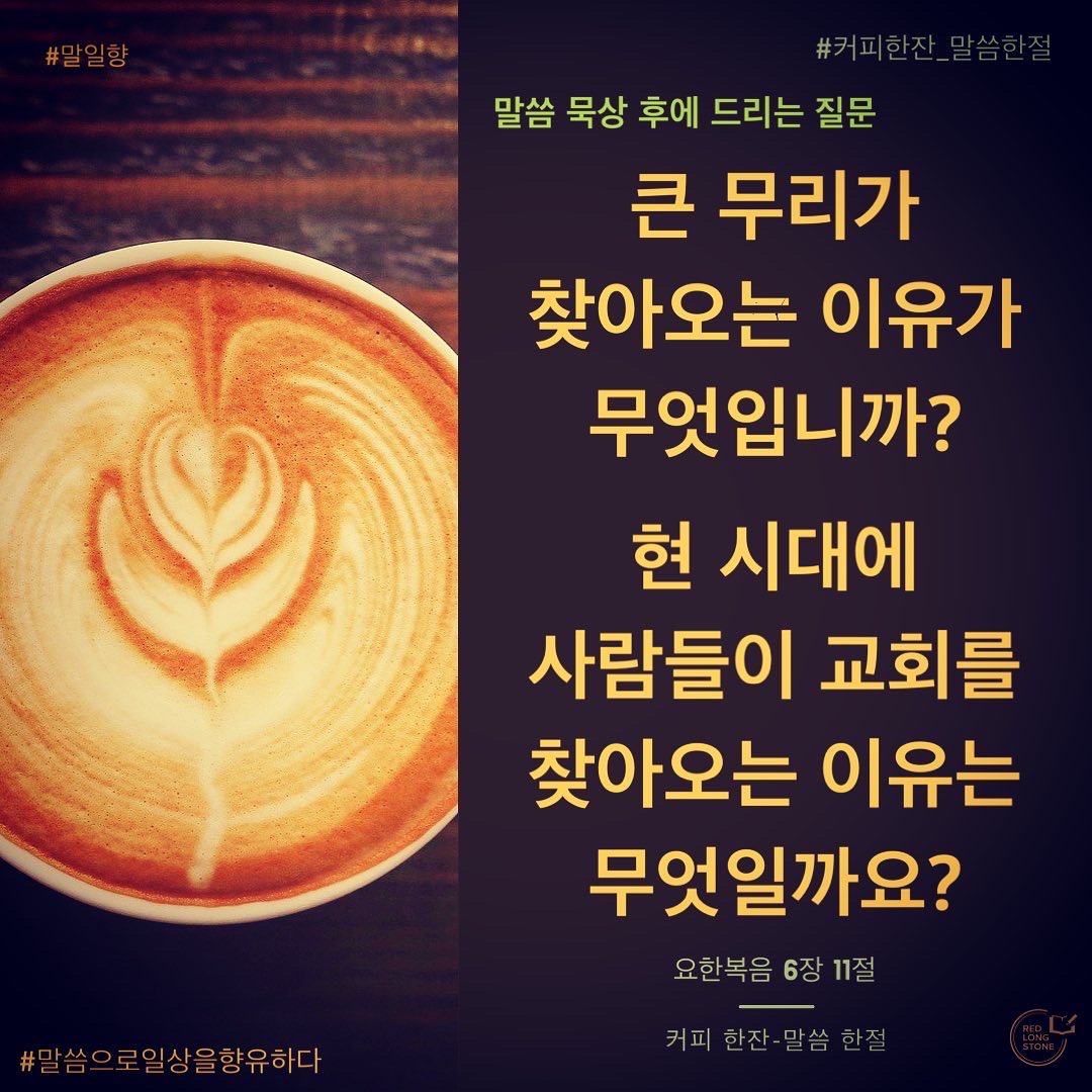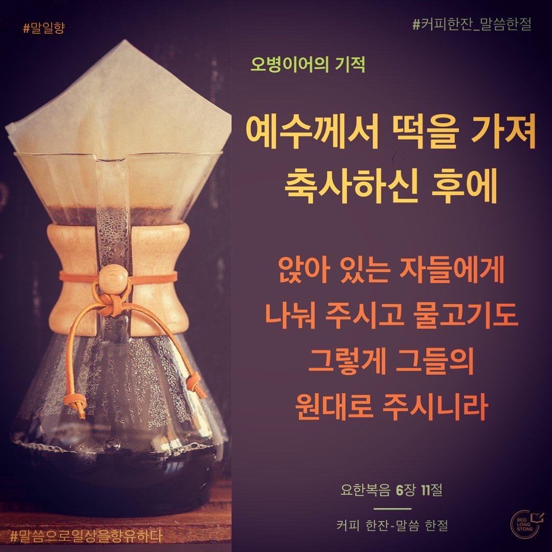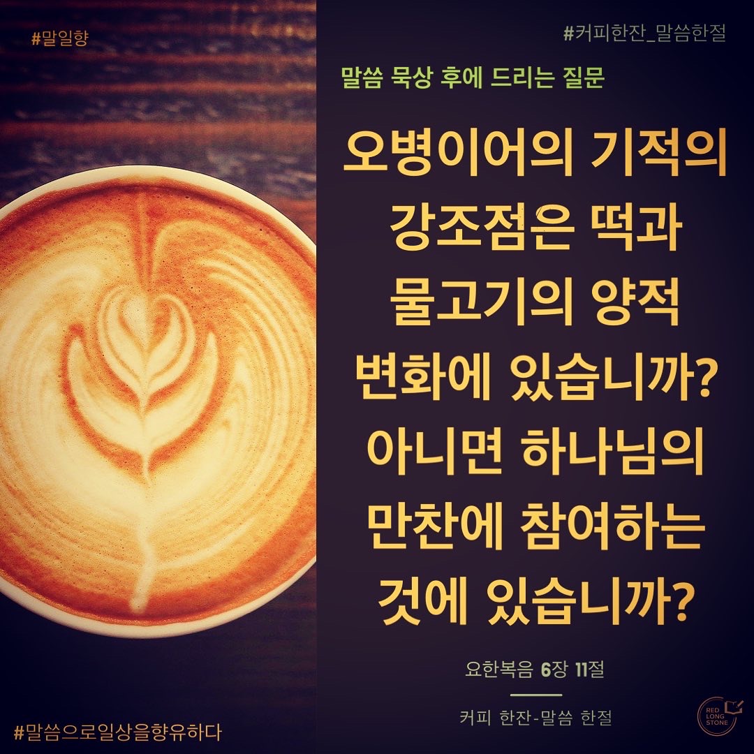 요한복음 6장의 오병이어의 기적을 마가복음 6장의 오병이어의 기적과 함께 보는 것이 유익합니다. 마가복음은 오늘 본문을 좀 더 구체적으로 서술하고 있습니다. “예수께서 떡 다섯 개와 물고기 두 마리를 가지사 하늘을 우러러 축사하시고 떡을 떼어 제자들에게 주어 사람들에게 나누어 주게 하시고 또 물고기 두 마리도 모든 사람에게 나누시매”(마가복음 6:41) 마가는 본문에서 4개의 동사를 사용하고 있습니다. “가지사”, “축사하시고”, “떼어”, 그리고 “주어" 이 4개의 동사를 마가는 마지막 만찬을 묘사하고 있는 14장 22절에 다시 한번 사용하고 있습니다. “예수께서 떡을 가지사 축복하시고 떼어 제자들에게 주시며” 왜 마가는 4개의 동사를 오병이어의 기적과 마지막 만찬에 동일하게 사용하고 있을까요? 마가복음 14장 22절 후반부에 보면 “이르시되 받으라 이것이 내 몸이니라” 하십니다. 예수님께서는 마지막 만찬에서 떡과 포도주를 자기의 몸과 피라고 하시며 먹고 마시길 원하십니다. 예수님의 십자가의 죽음을 예표 하는 것입니다. 예수님의 죽음으로 말미암아 우리의 죄가 용서되고 예수님의 의가 우리에게 전가되는 것입니다. 바로 우리가 그리스도의 몸과 피를 먹음으로서 그리스도와 연합되는 것입니다.