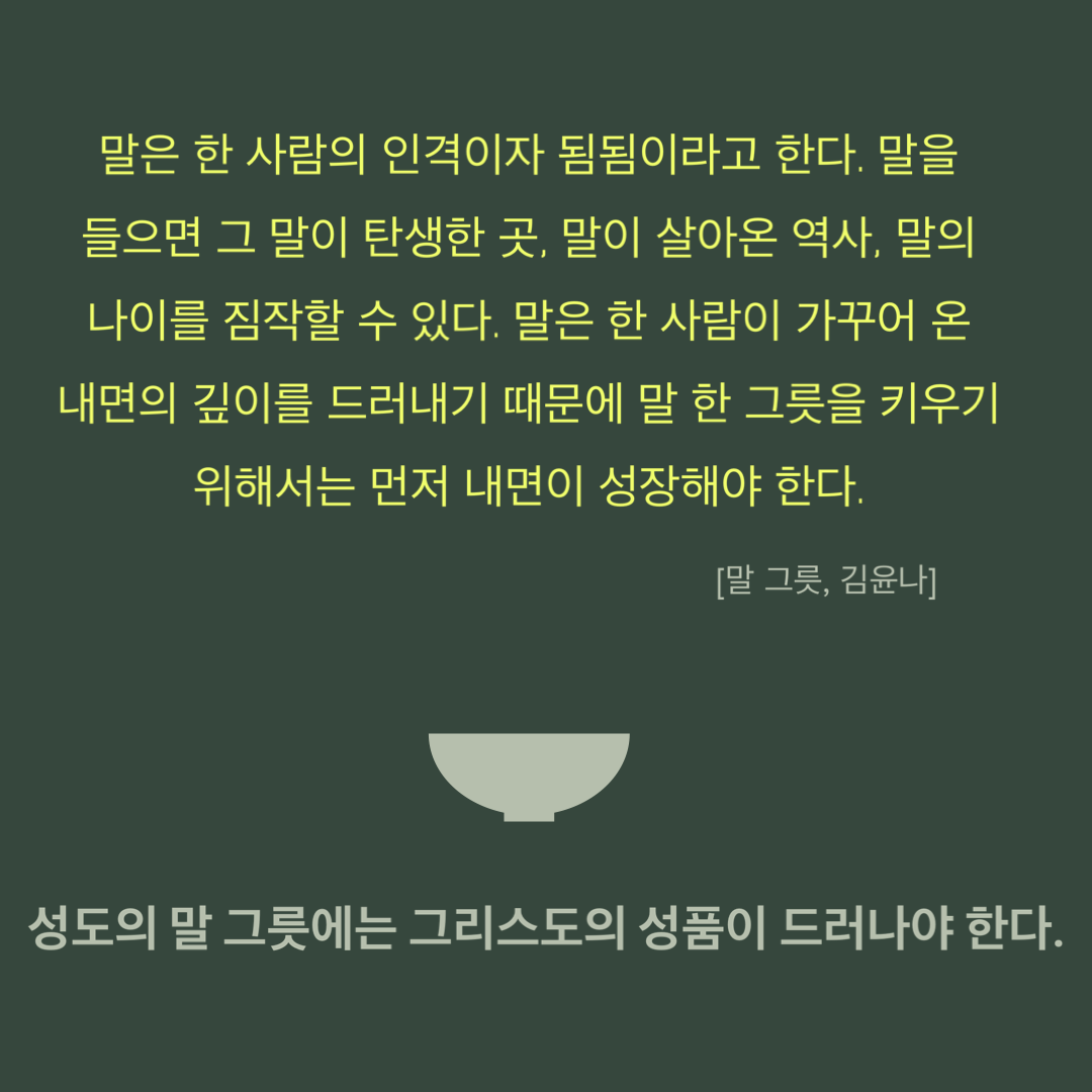 말은 한 사람이 가구어 온 내면의 깊이를 드러내기 때문에 말 한 그릇을 키우기 위해서는 먼저 내면이 성장해야 한다."