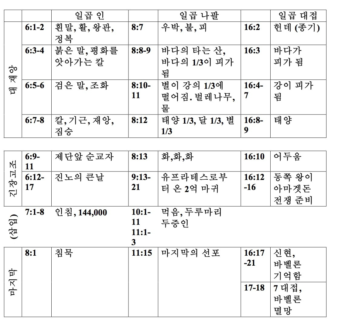 요한계시록 6장부터 8장 1절까지는 일곱 인으로 봉인된 두루마리 책을 떼는 장면을 기록하고 있습니다. 이 두루마리 책은 어린양이신 예수 그리스도께서 취하시고 어린양이 일곱 인을 하나씩 뗄 때마다 하나님의 보좌로부터 심판들이 일어납니다. 세 개의 일곱 심판 시리즈는 일곱 인들(6:1-8:1: 8:3-5), 일곱 나팔들(8:2; 8:6-11:19), 일곱 대접들(15:1; 15:5-16:21)로 구성되어 있습니다. 리챠드 보캄 교수는 요한계시록 구조를 설명하면서 세 개의 일곱 심판 시리즈의 유사성을 지적합니다. (제가 간략하게 도표로 정리해 보았습니다)