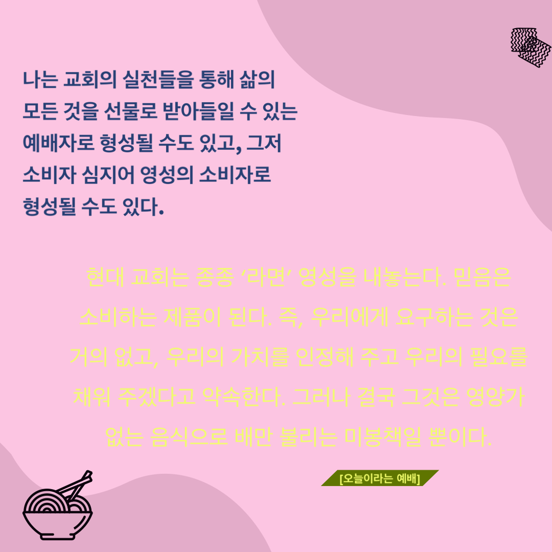 "현대 교회는 종종 '라면' 영성을 내 놓는다. 믿음은 소비하는 제품이 된다.